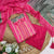 A women's three-piece Indian outfit, likely Kurti set Appears to be a casual or semi-formal design. dominated by a bright, vibrant pink with accents of a muted grey and gold slightly curved neckline. Combines the bright pink of the kurta and pants with the green/grey accent color.